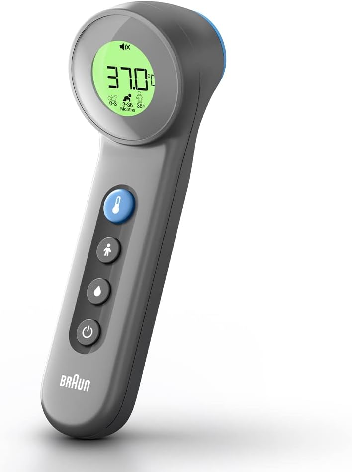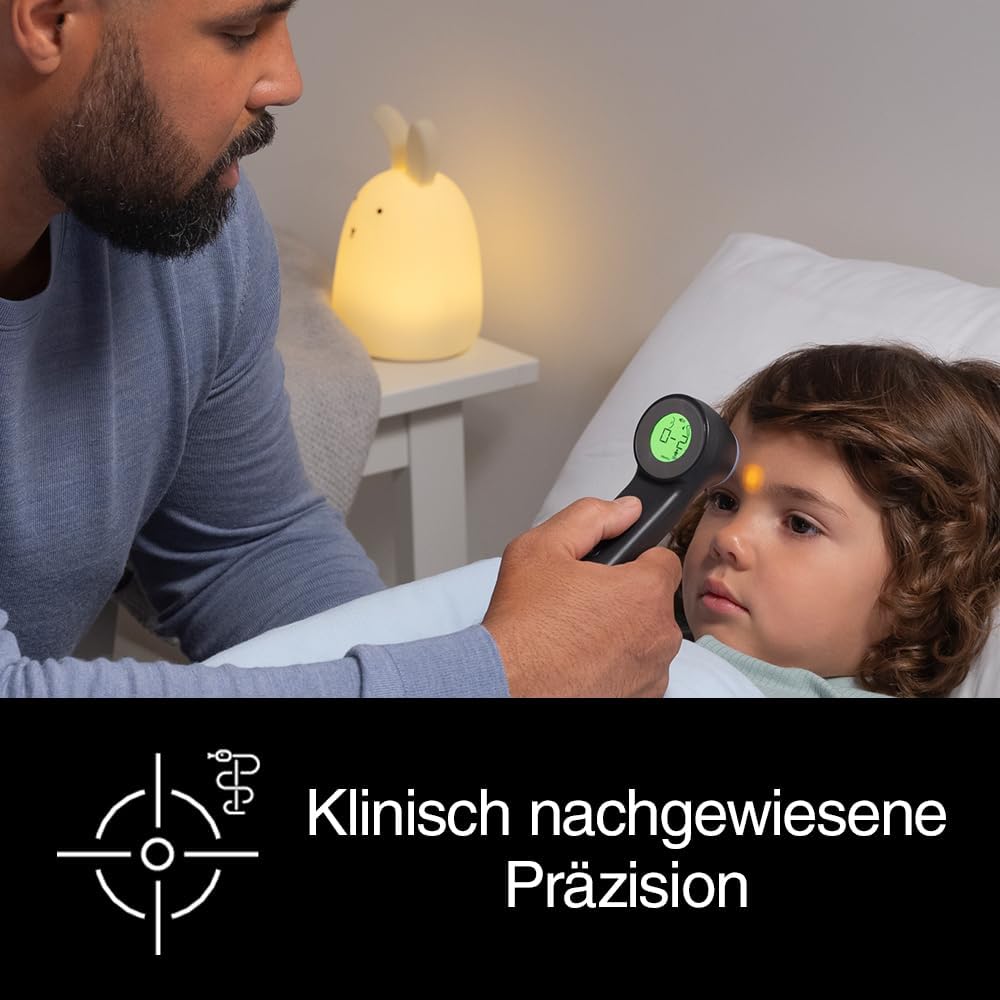 Mit dem Braun Sensian 7 kontaktlosen Stirnthermometer erhalten Sie dank Age Precision-Technologie präzise Temperaturmessungen. Das Thermometer von der Nummer 1 bei Ärzten1 bietet 3-in-1-Messungen von Körper, Lebensmitteln und Flüssigkeiten. Es verfügt über PositionCheck – eine Kombination aus Ziellicht, Näherungssensor und Anweisungen auf dem Display, mit der genaue Messungen möglich sind*, sowie die Age Precision- Technologie, die eine hervorragende Fieberkontrolle und eine bessere Einschätzung des Krankheitsverlaufs ermöglicht2,3. Das Thermometer kann im Kontaktmodus oder im kontaktlosen Modus verwendet werden, und die Lautlosfunktion sorgt dafür, dass nächtliche Messungen Ihr schlafendes Kind oder Baby nicht stören. Nicht auf Körpermessungen beschränkt – im Oberflächenmodus können Sie auch die Temperatur von Flüssigkeiten messen, einschließlich Baby-Nahrung und sogar Badewasser. *Um eine genaue Messung zu erhalten, muss das Gerät in einem Abstand von maximal 2,5 cm von der Stirn zwischen die Augenbrauen zielen.