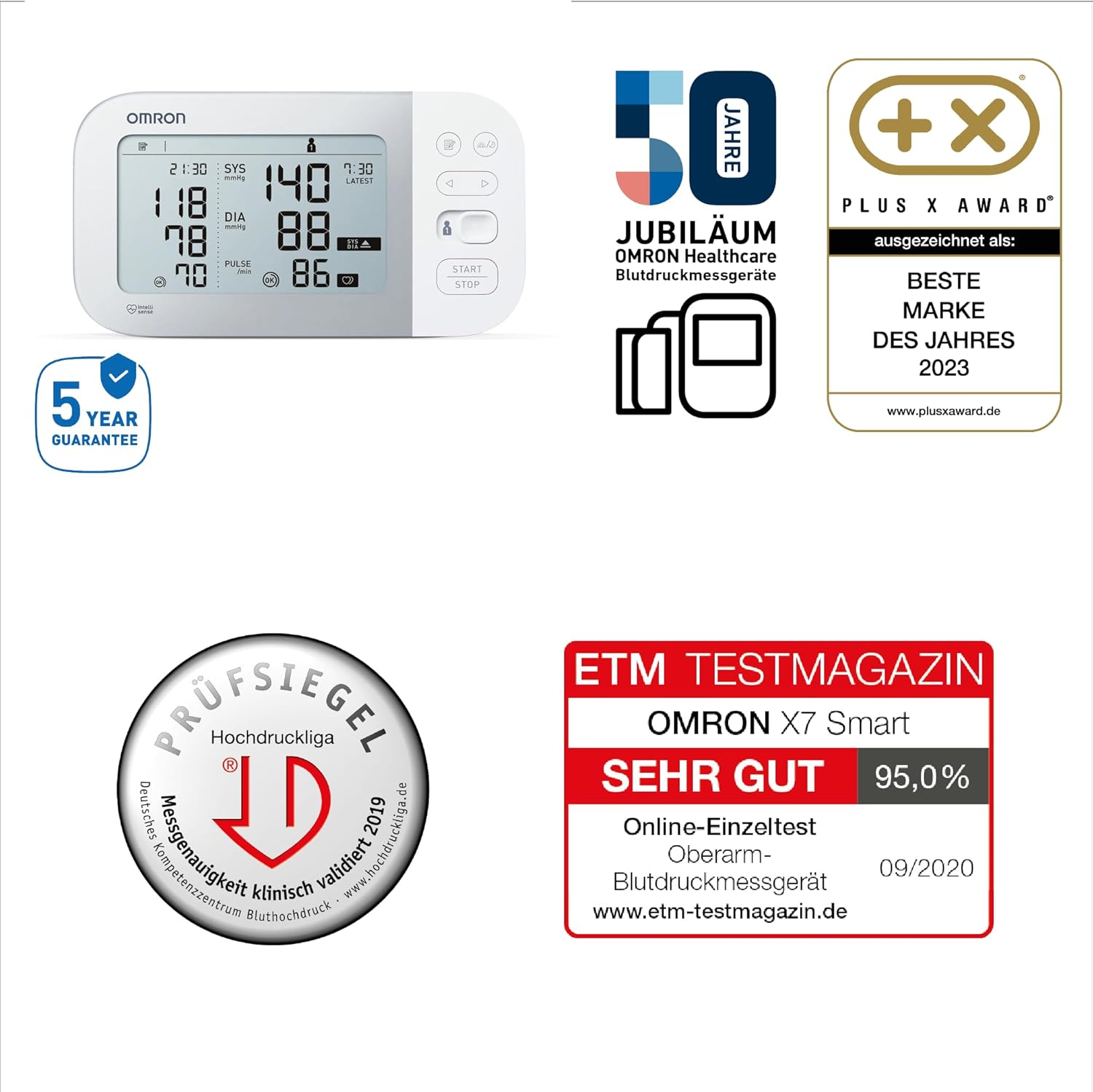 Test: OMRON X7 Smart – Automatisches Oberarm-Blutdruckmessgerät | Testsieger Stiftung Warentest 11/23 | AFib-Erkennung | klinisch validiert – auch für Diabetiker | mit kostenloser Smartphone App | 22-42 cm