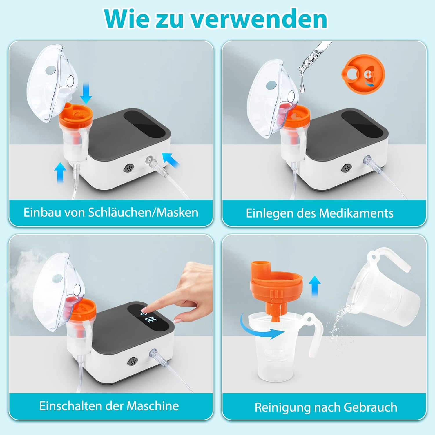 Die digitale LED-Timer-Anzeige ermöglicht eine genaue Steuerung der Behandlungszeit, während das Gerät tragbar und leicht ist. Mit dem einstellbaren Verneblungsvolumen und dem umfangreichen Zubehörset ist es für die ganze Familie geeignet.